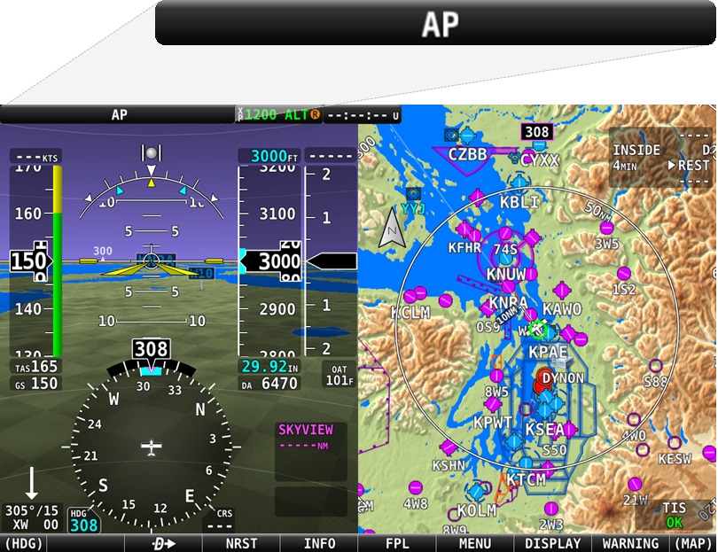 The optional SkyView Autopilot integrates with SkyView HDX to provide you with automated control of your airplane in the pitch and roll axes. This means that you can command the autopilot to follow your pre-defined flightplan, fly direct-to a waypoint, VOR, or airport, and turn to and maintain the heading or track of your preference. The autopilot will also climb or descend to and maintain the altitude of your choice using either vertical speed or airspeed to control the climb and descent rate. The autopilot will fly any instrument precision approach or non-precision approach when your aircraft is equipped with a compatible third-party IFR navigation device.